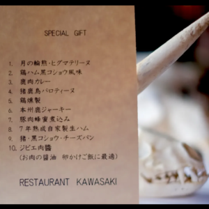 狩猟の資格を持つシェフが狩猟期間中、90日(ほぼ毎日)は自ら山に入って野鳥を仕留めるほか、信頼する狩猟者から鹿、猪、熊など旬のジビエを直接会話して仕入れる。狩猟場所、年齢、食べているエサによって味も食感も異なるジビエ。富士山麓のジビエの味を探求し、山と調理場を行き交う。